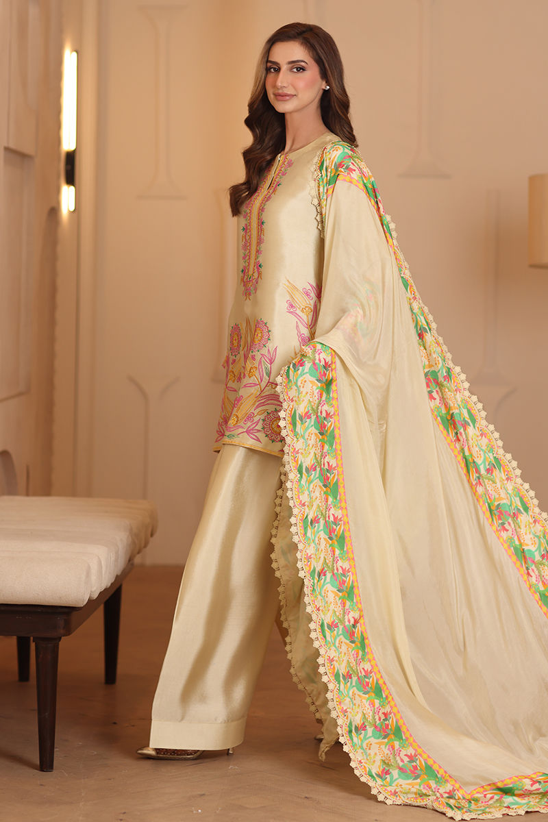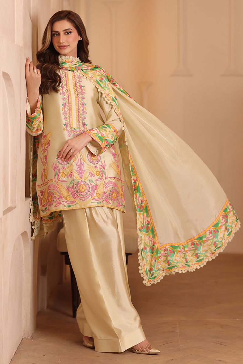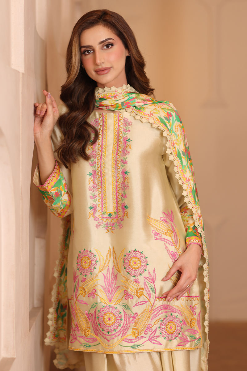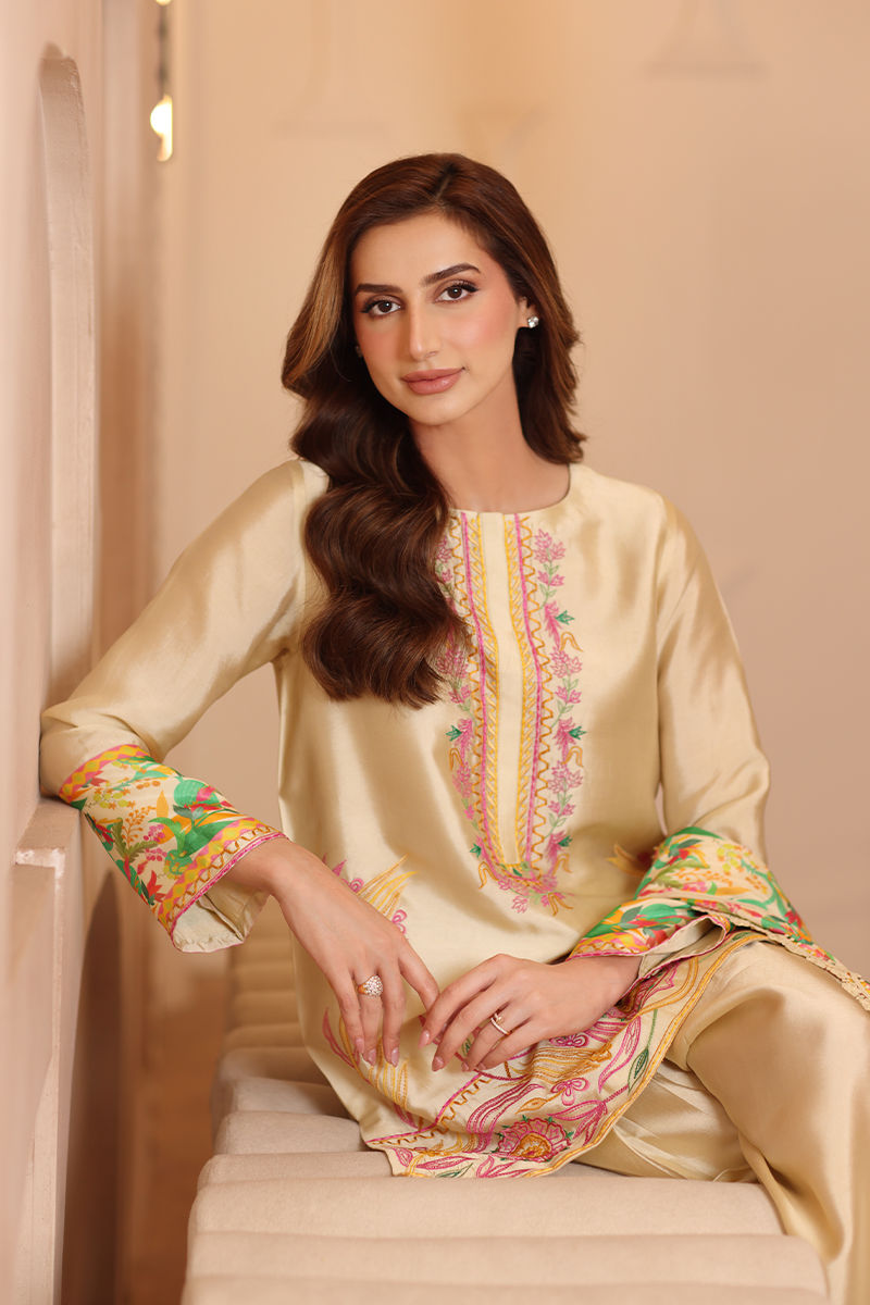 A sheesha silk shirt adorned with intricate embroidery for a refined, elegant look. The digital print sleeves, enhanced with delicate embroidery, add a vibrant contrast. Finished with an attached chiffon lining for a graceful, flowing silhouette.