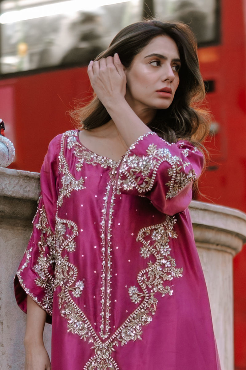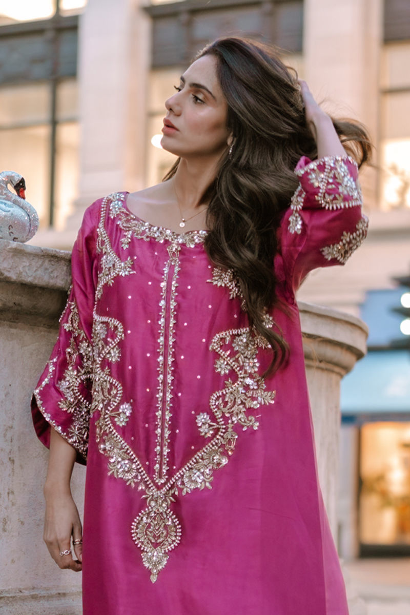A striking vision in fuschia, this pure raw silk kaftan is adorned with a symphony of pearls, Swarovski, sequins, nakshi, and gold and silver cut daana, with zevar moti delicately tracing the neckline, daman, and slit. The daman glows with tilla work and pearls, creating an opulent finish. Paired with sleek pants, this flowing silhouette exudes effortless grace, blending regal grandeur with timeless romance.