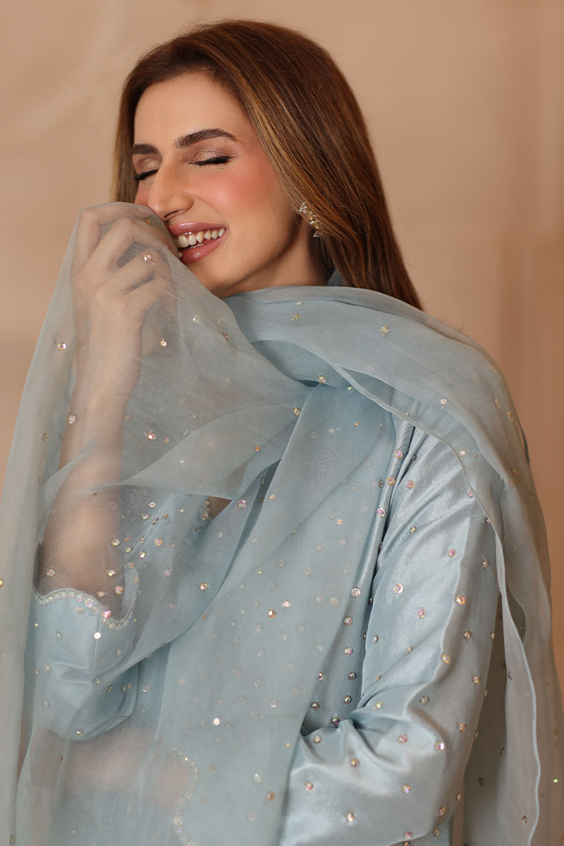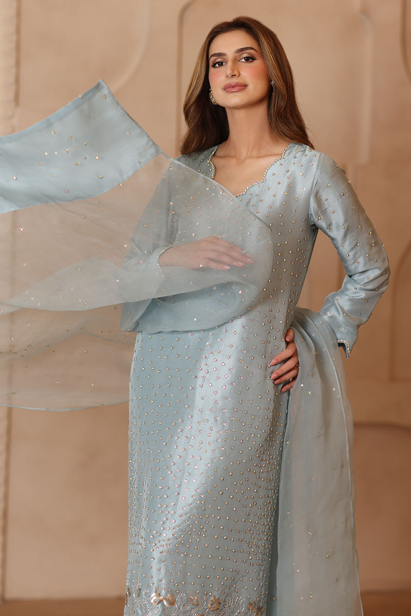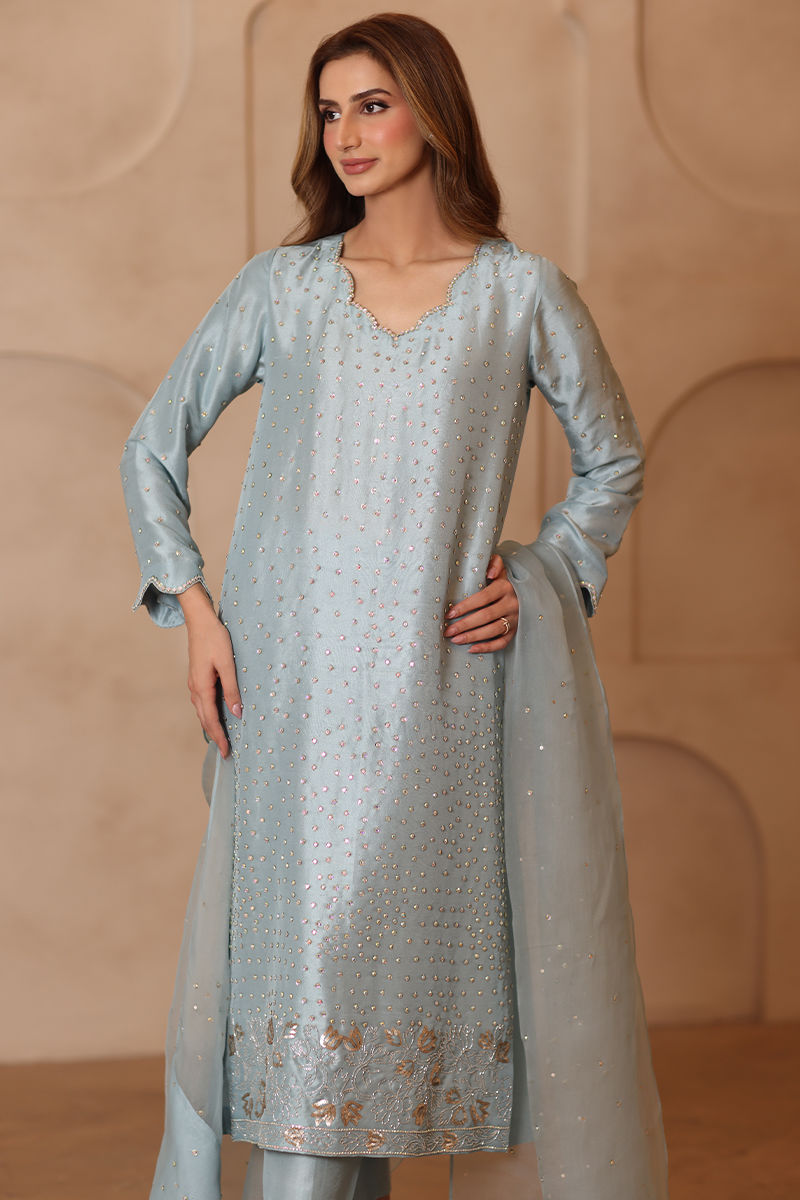 A pure raw silk shirt adorned with Swarovski crystals and sequins work all over for a luxurious shimmer. The scalloped sleeves and neckline add soft, feminine elegance. A heavy handworked border with sequins and Swarovski completes the refined look. Shirt length 48'.