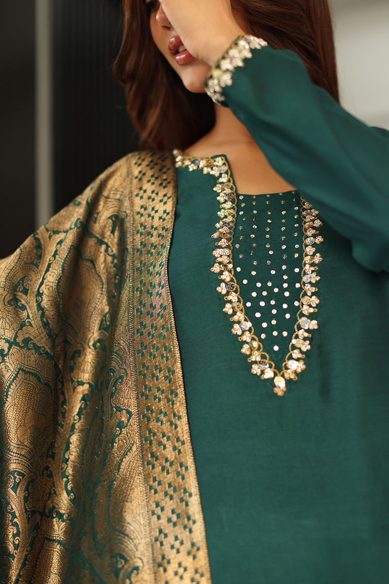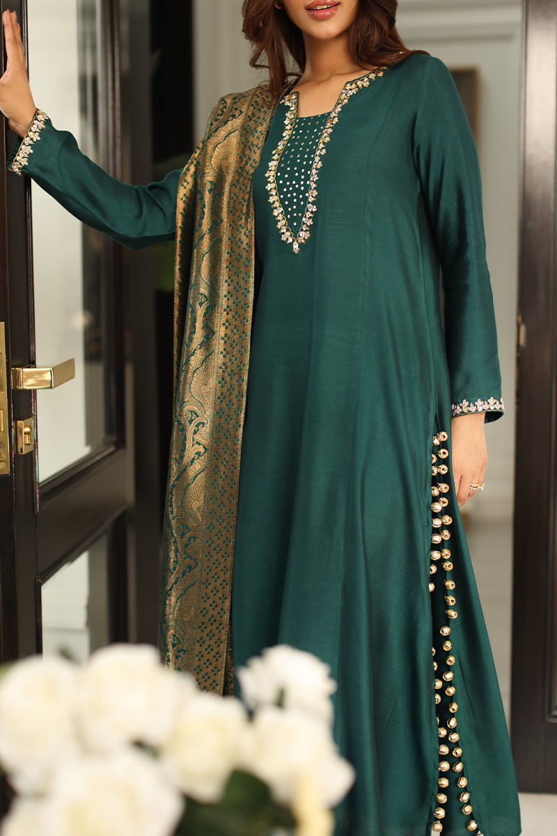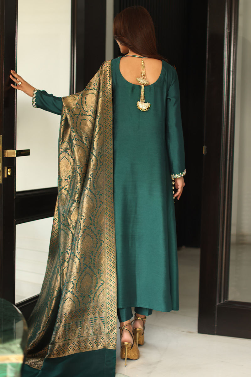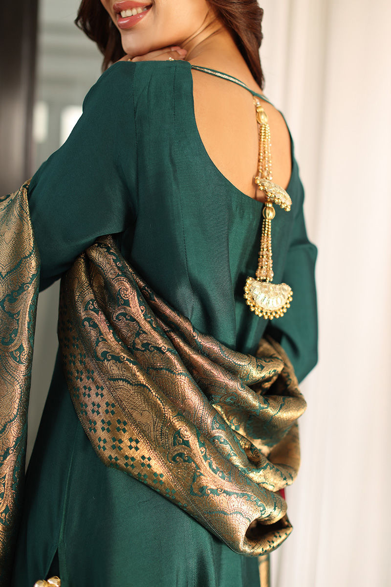 This statement ensemble features a khaddi silk A-line panelled shirt, adorned with hand-embellished sequins and nakshi detailing on the neckline and sleeves, finished with elegant gota buttons along the slits. A low back design with delicate tassel hangings adds a graceful, contemporary touch, paired effortlessly with straight khaddi silk pants. The look is completed with a chiffon khimkhwab dupatta, framed with a rich maroon Korean raw silk finish all around.