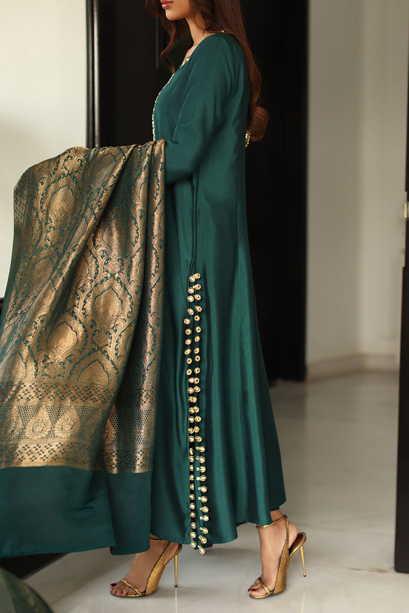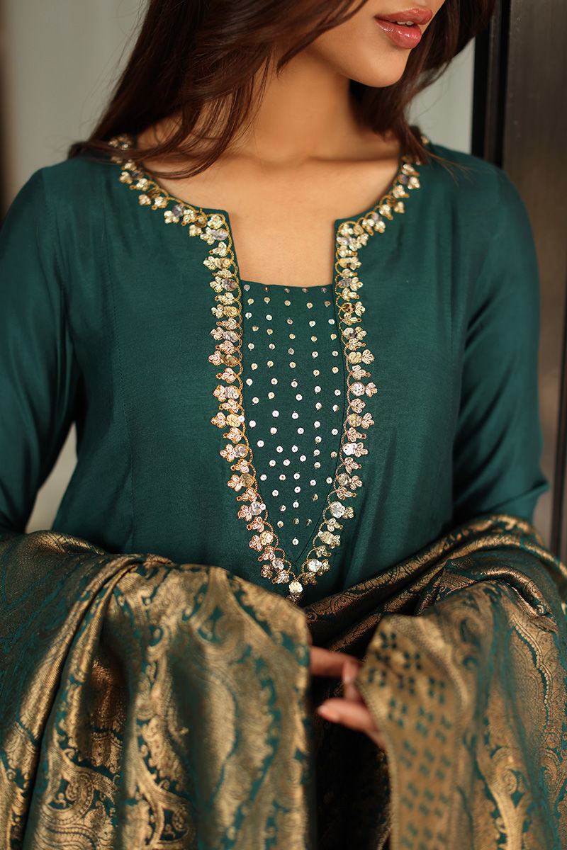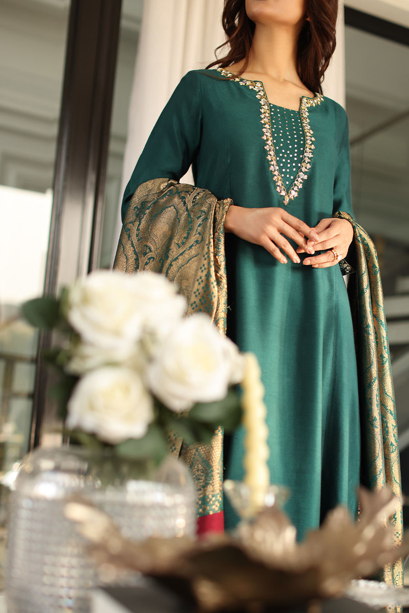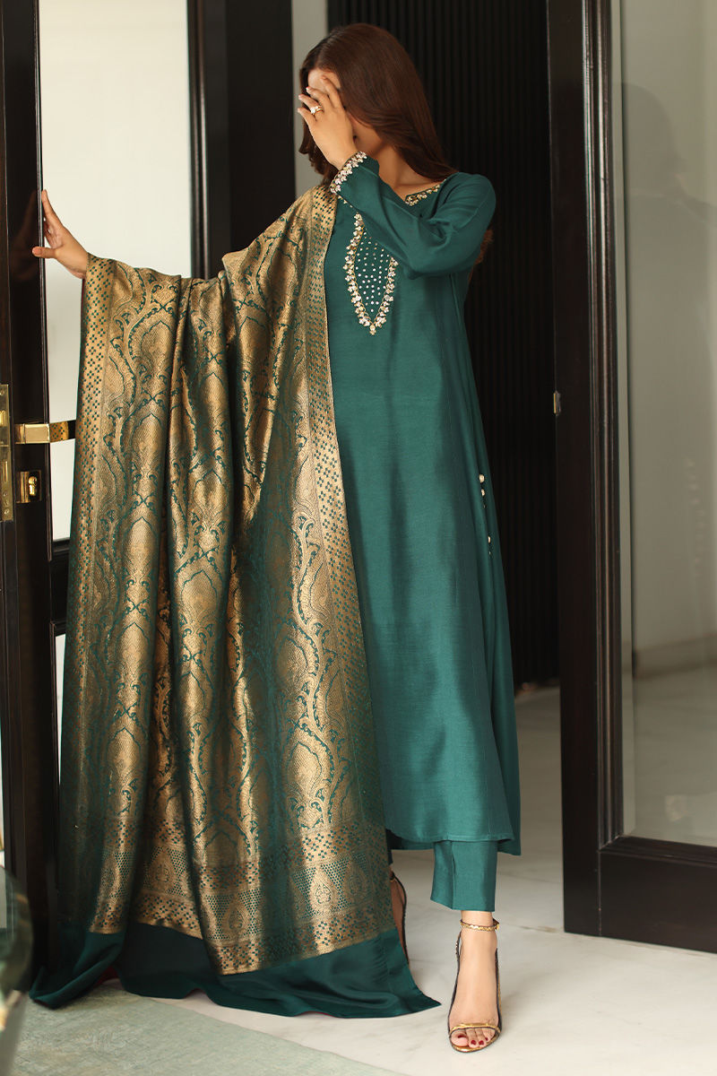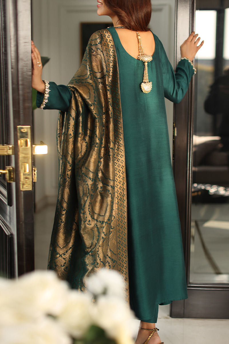 This statement ensemble features a khaddi silk A-line panelled shirt, adorned with hand-embellished sequins and nakshi detailing on the neckline and sleeves, finished with elegant gota buttons along the slits. A low back design with delicate tassel hangings adds a graceful, contemporary touch, paired effortlessly with straight khaddi silk pants. The look is completed with a chiffon khimkhwab dupatta, framed with a rich maroon Korean raw silk finish all around.