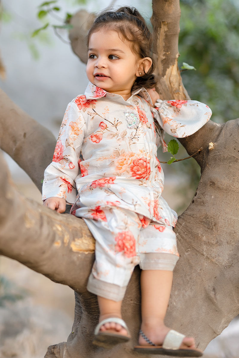Our scintillating outfit “Mini Eris” features a digital floral print on raw silk with a collar, pleats and hand-embellished to bring the best festive outfit for you to make your special days even more special. It comes along with culottes to complete the signature look. This outfit includes shirt and pants.