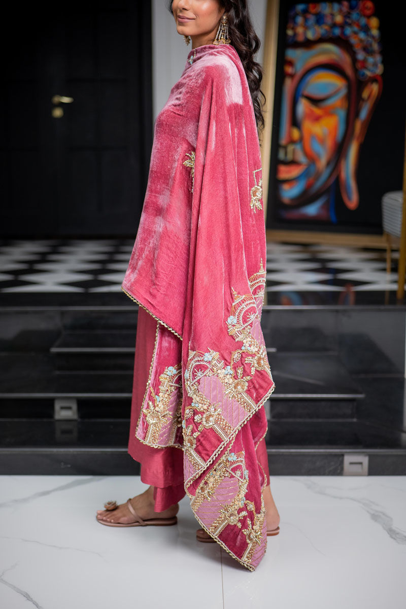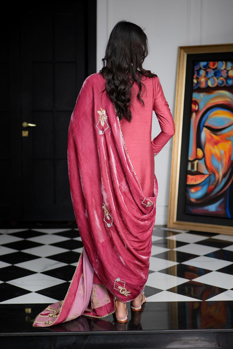 An ode to timeless grace; Mira rendered in tea pink, this look exudes soft luxury. A silk shirt and pant, delicately adorned with Swarovski details on the sleeves, perfectly complement the pure velvet shawl hand-embellished with dabka, resham, and cut daana, finished with intricate lace all around. A silhouette that whispers elegance in every fold.