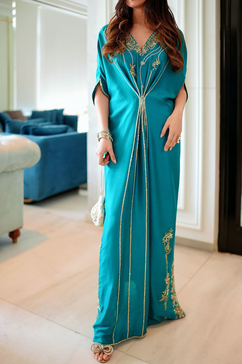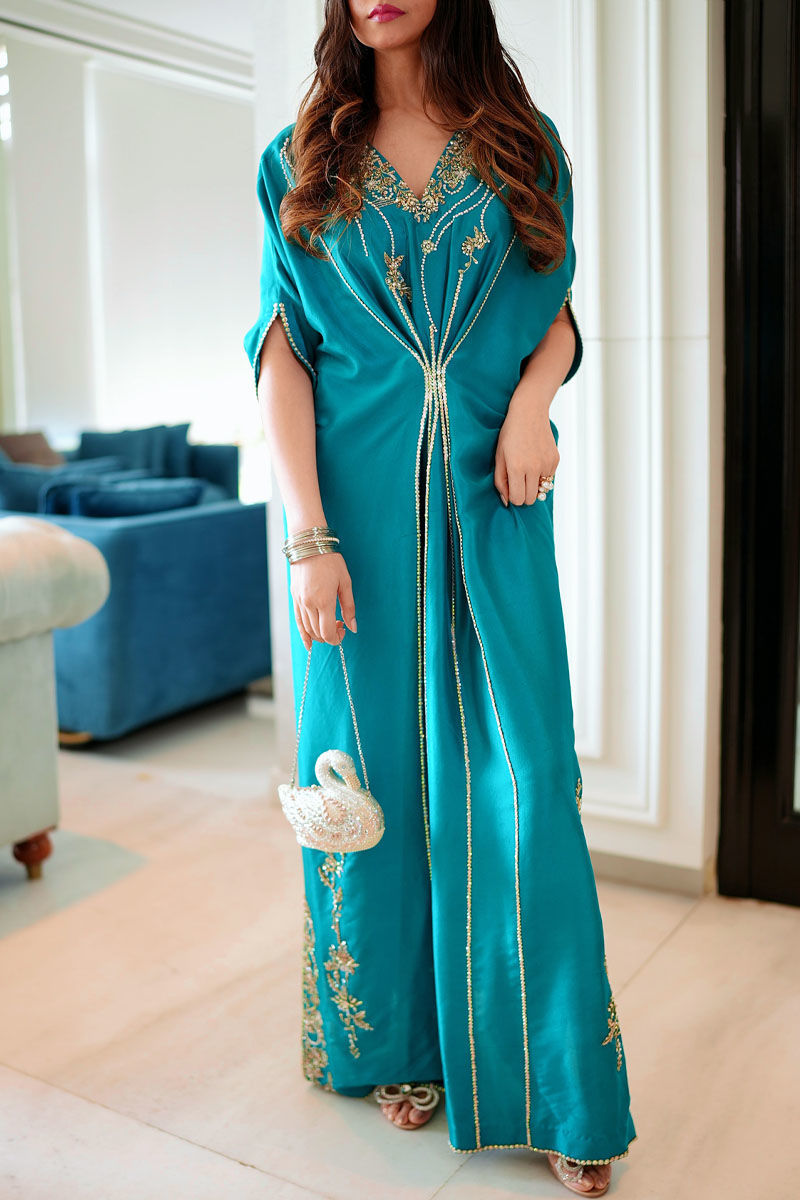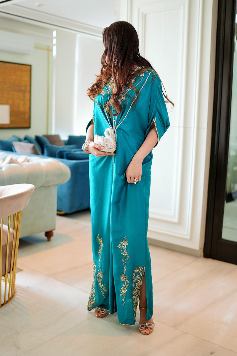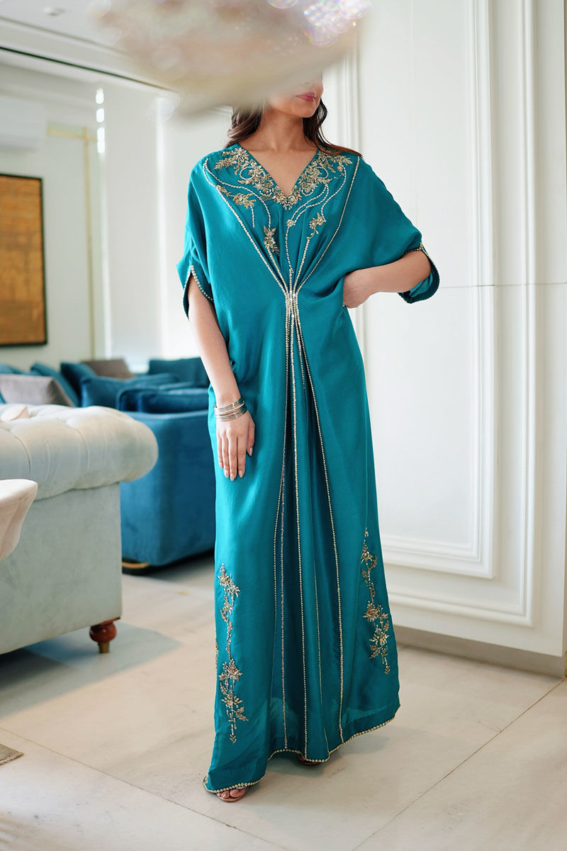 Drenched in turquoise green, Miraat radiates regal charm - a pure raw silk kaftan adorned with intricate adda work, shimmering Swarovski, dabka, and gota detailing. A statement of timeless elegance and effortless grandeur.