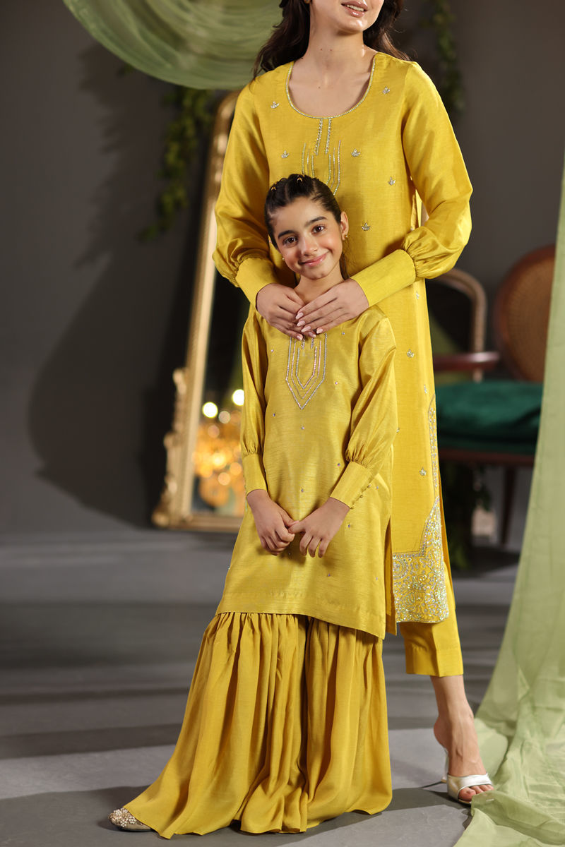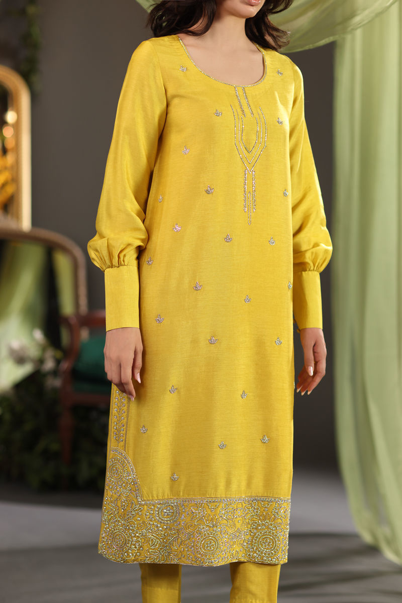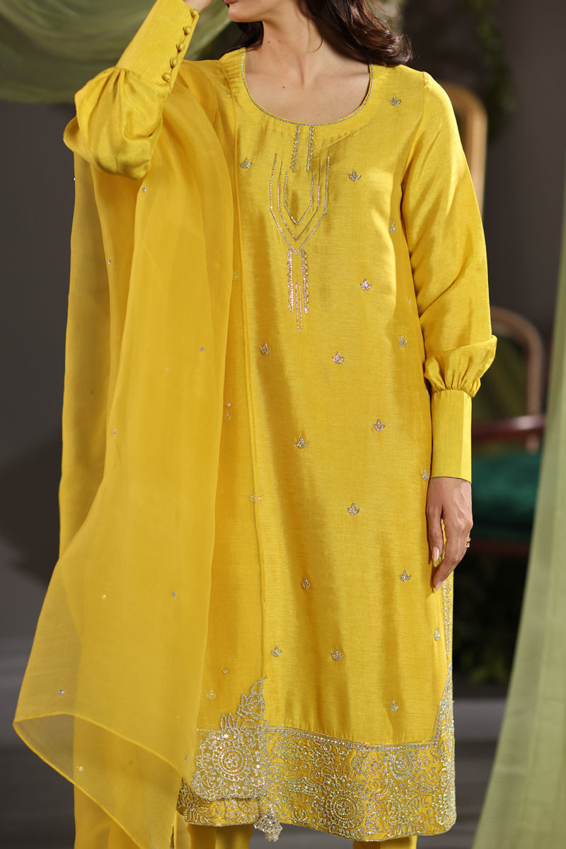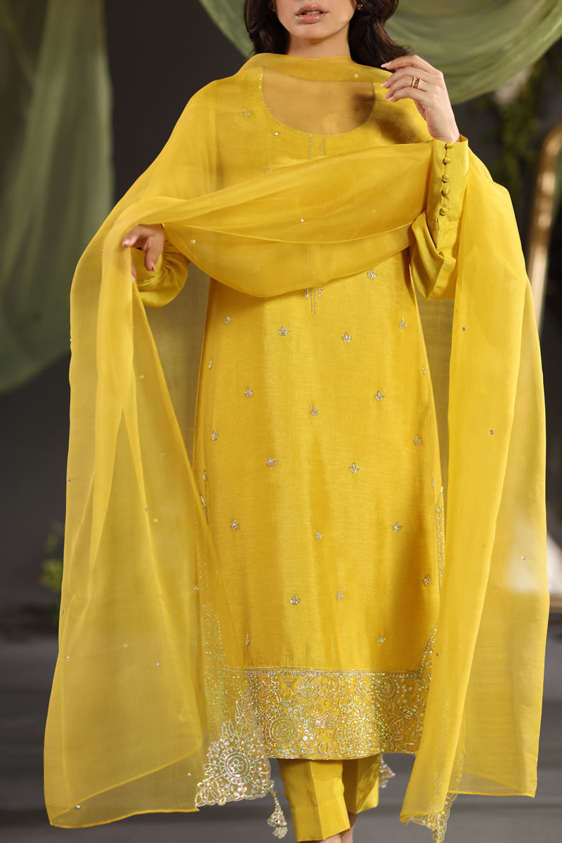 Color: Mustard Fabric: Pure Raw Silk and Pure Organza Work Details: Multi Swarovski & cut daana