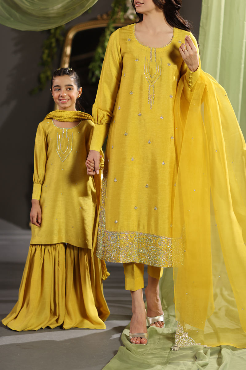Elegance meets luxury with the Mustani dress, crafted from pure raw silk for a soft yet refined look. The shirt and pant are beautifully complemented by Swarovski embellishments on the neckline, daman, and sleeves. The graceful organza dupatta, is adorned with sparkling Swarovski and a hand-embellished border on all four corners, making it a perfect choice for any festive occasion.