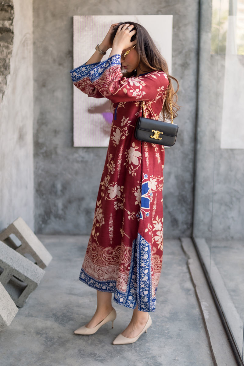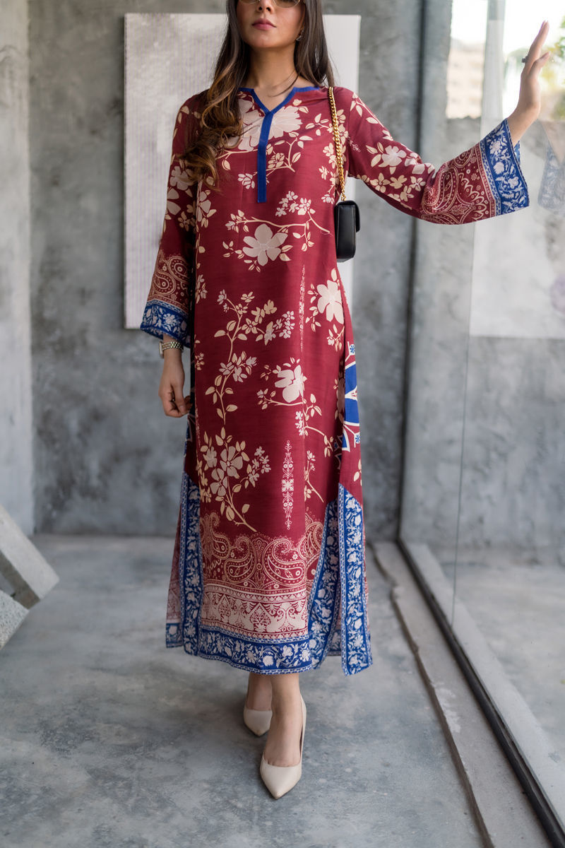 Serving major vibes. Deep maroon & blue digital print shirt in soft fabric with a sleek side slit. A stunner that’s equal parts comfy and cool.