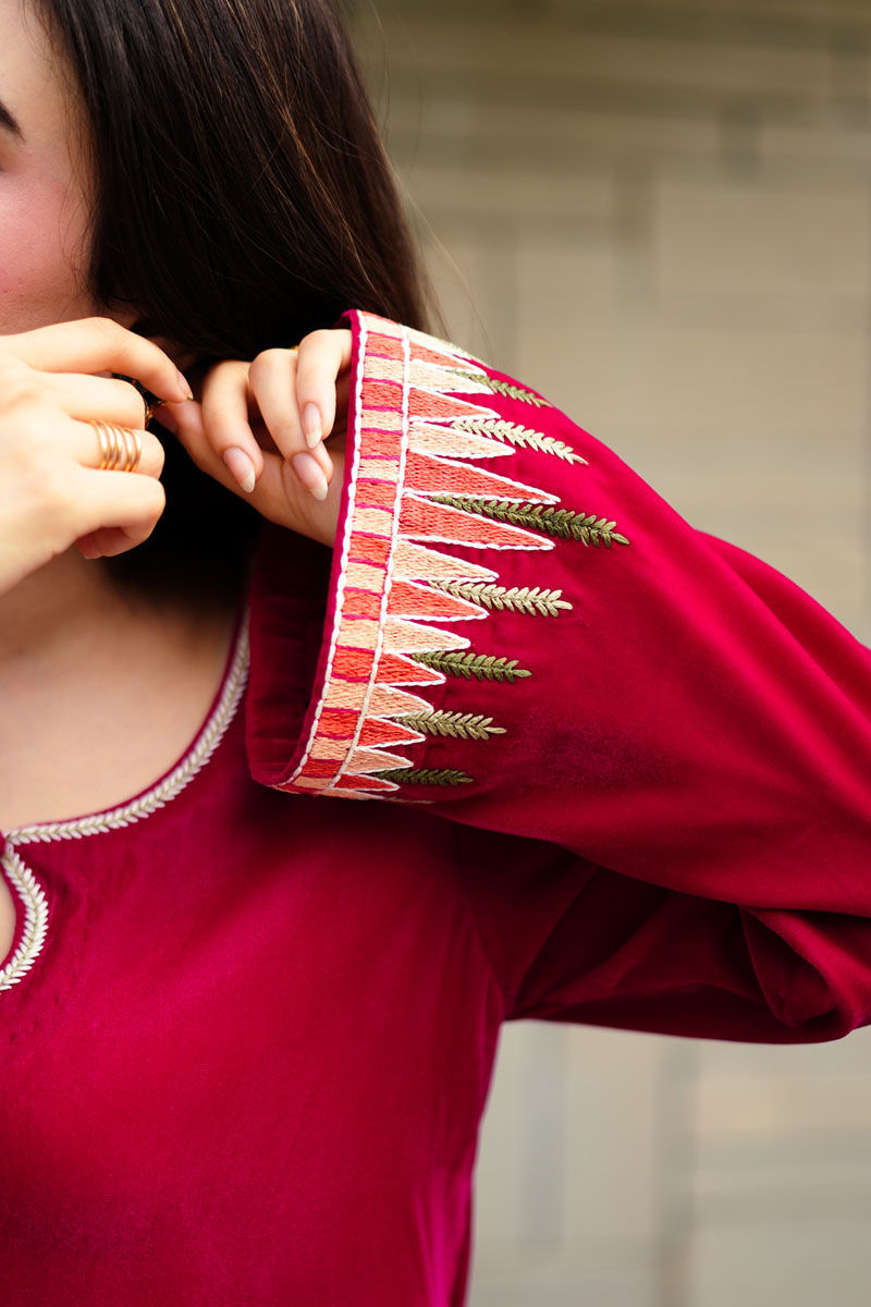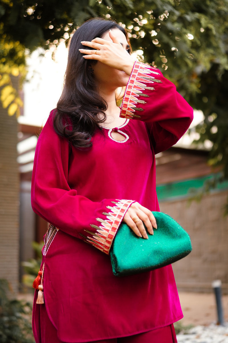Reshna - beautiful, and irresistibly chic. Drenched in shocking pink velvet, it features intricate embroidery on the neckline and sleeves, finished with playful tassels for a touch of festive flair.
