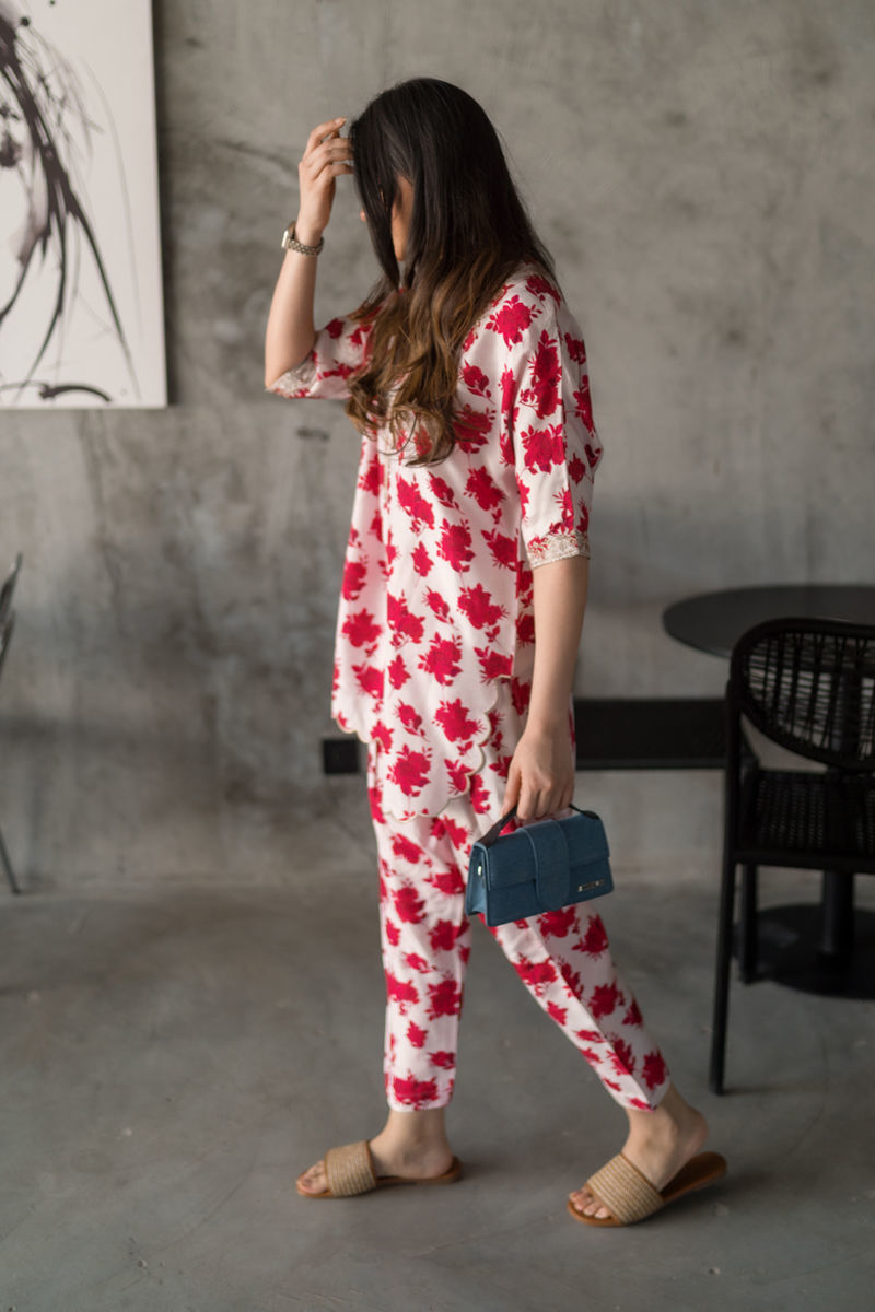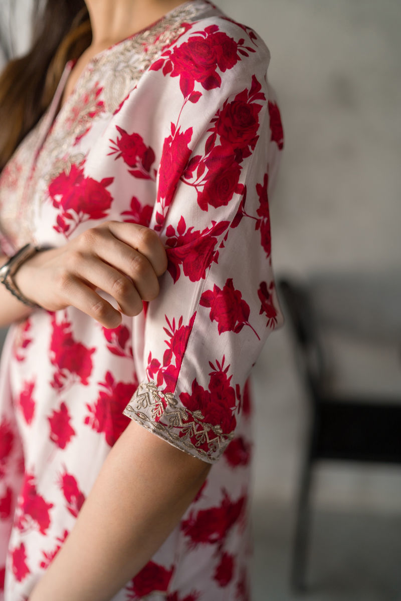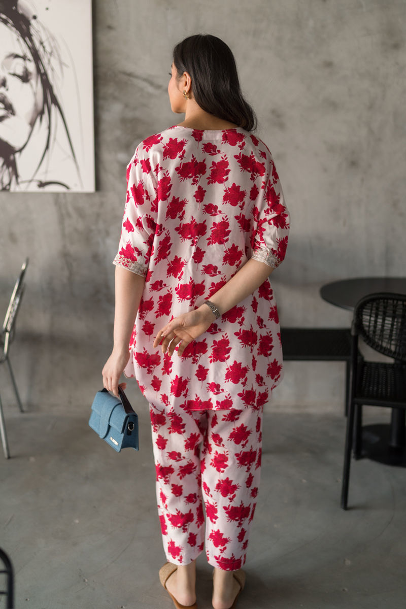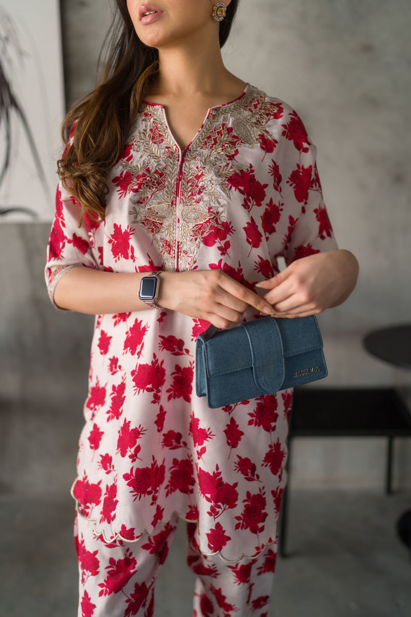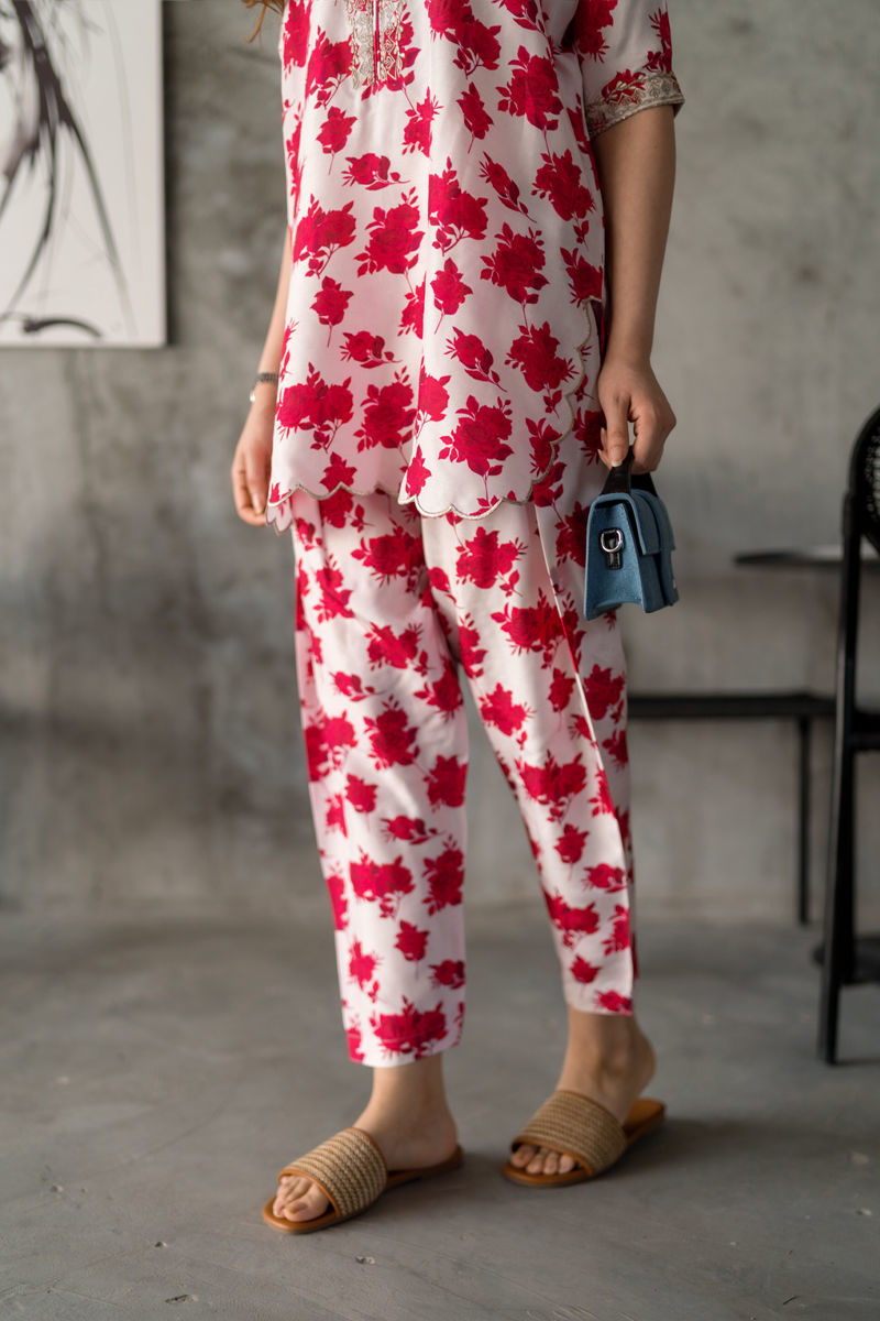 Flowy balloon cut shirt in red & white, paired with a sleek skinny shalwar for that effortless vibe. Free-size comfort meets soft chic.