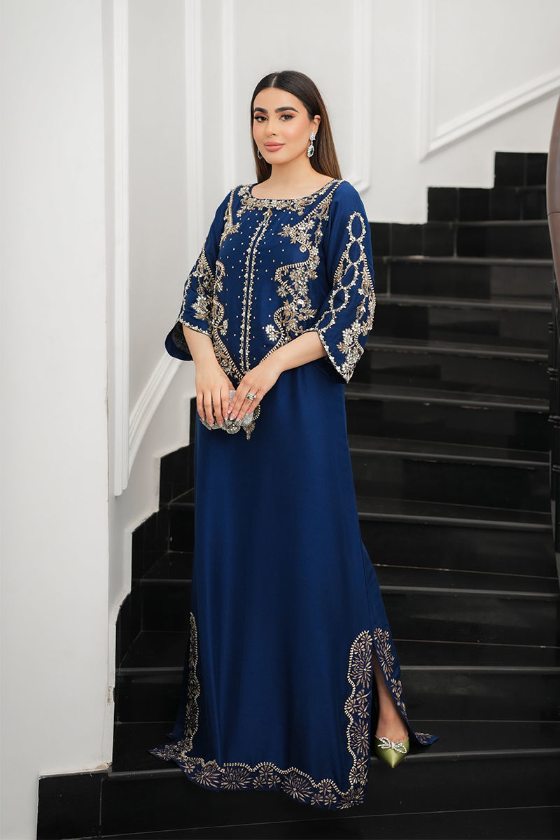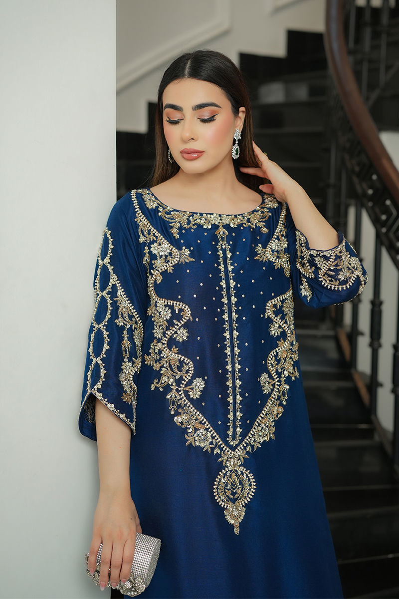 A striking vision in blue, this pure raw silk kaftan is adorned with a symphony of pearls, Swarovski, sequins, nakshi, and gold and silver cut daana, with zevar moti delicately tracing the neckline, daman, and slit. The daman glows with tilla work and pearls, creating an opulent finish. Paired with sleek pants, this flowing silhouette exudes effortless grace, blending regal grandeur with timeless romance.