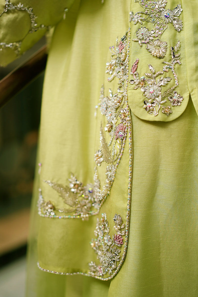 Color: Lime Green Fabric: Korean Raw Silk Work Details: Hand Embellished Pearls, Sequins, Knots of Resham and Swavroski