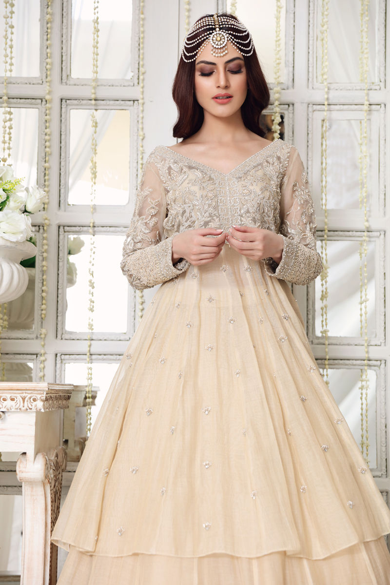 Zari net A-Line shirt with pearl booti on kaliyan and hand worked crystal stone and cut dana handwork on the body and sleeves. Zari net lehnga with crush tissue finishing. Peach net dupatta with pearl booti chan all over.