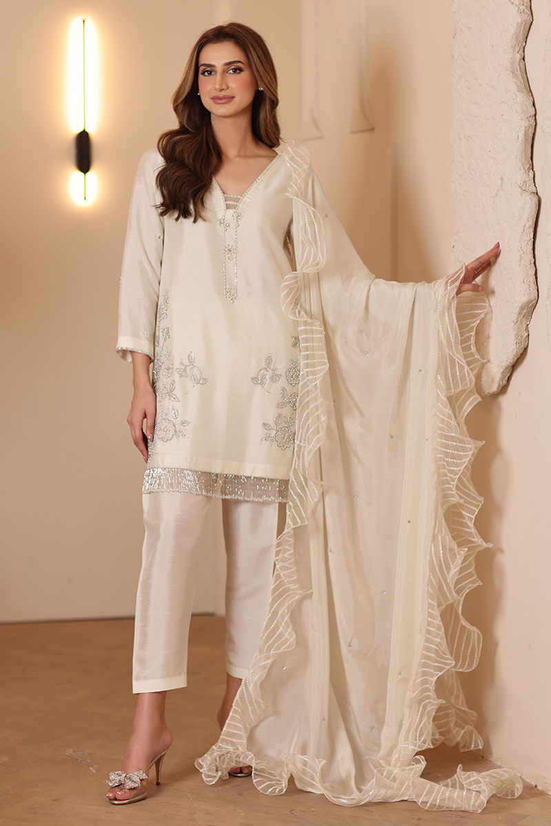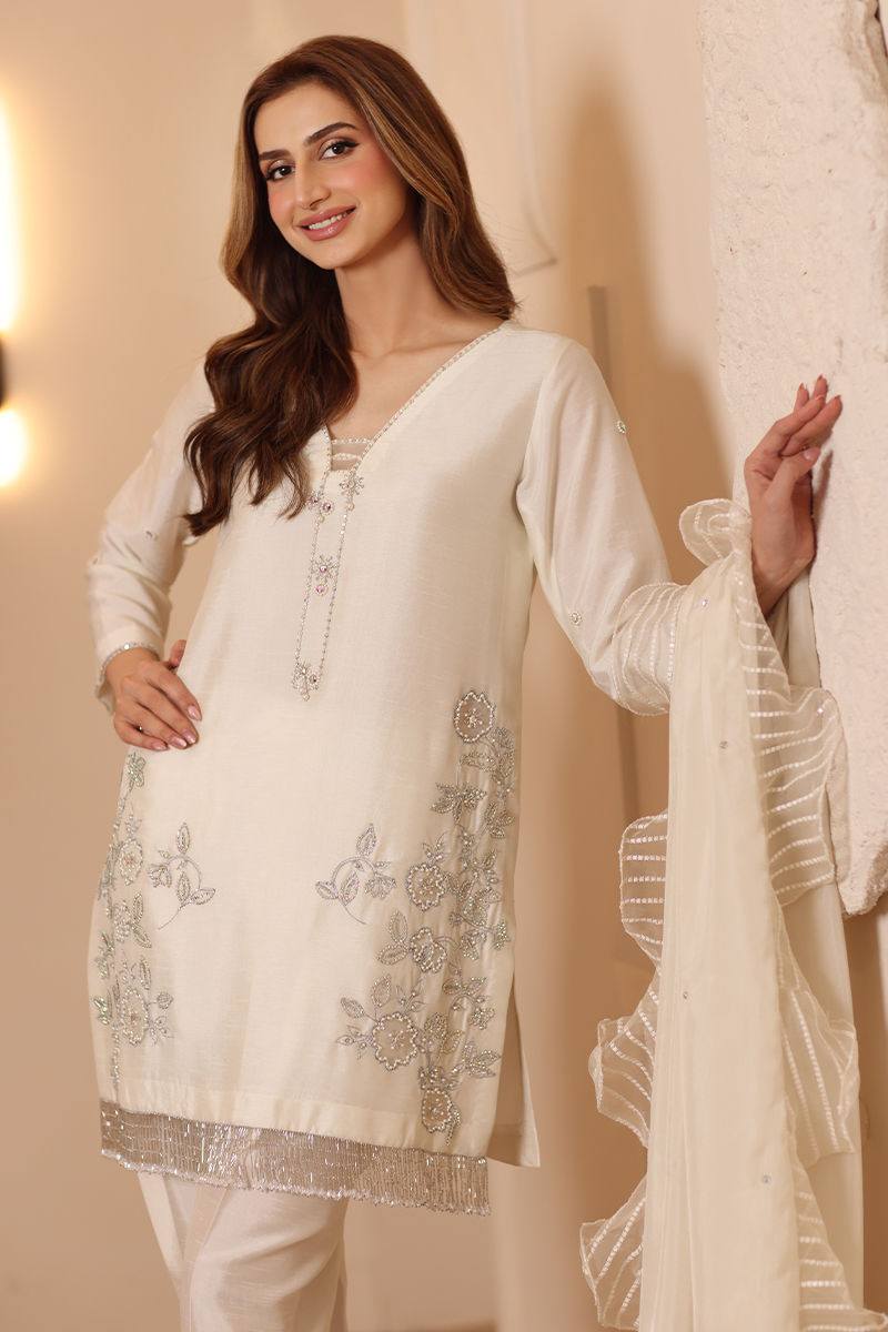 Designed in luxurious Korean raw silk, this shirt showcases exquisite embellishments of Swarovski, cut daana, and tassels. The cutwork detailing enhances its overall charm. Paired with a skinny shalwar for a polished and elegant look.