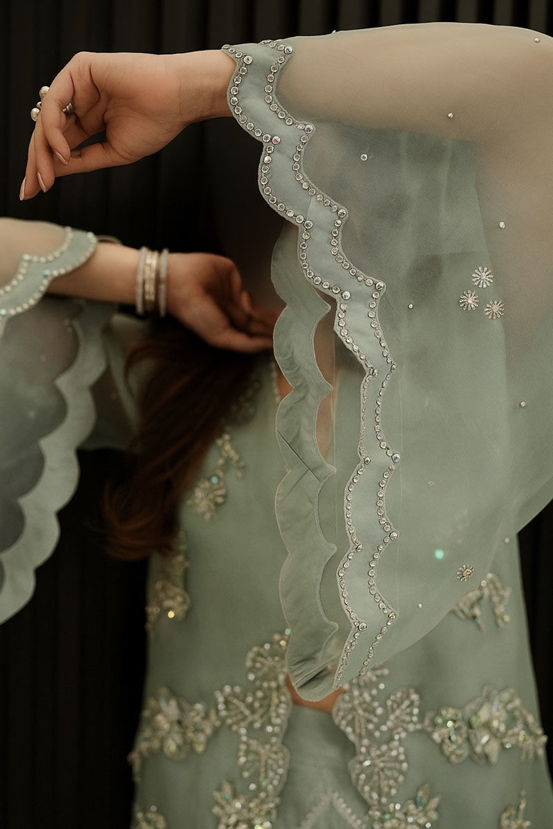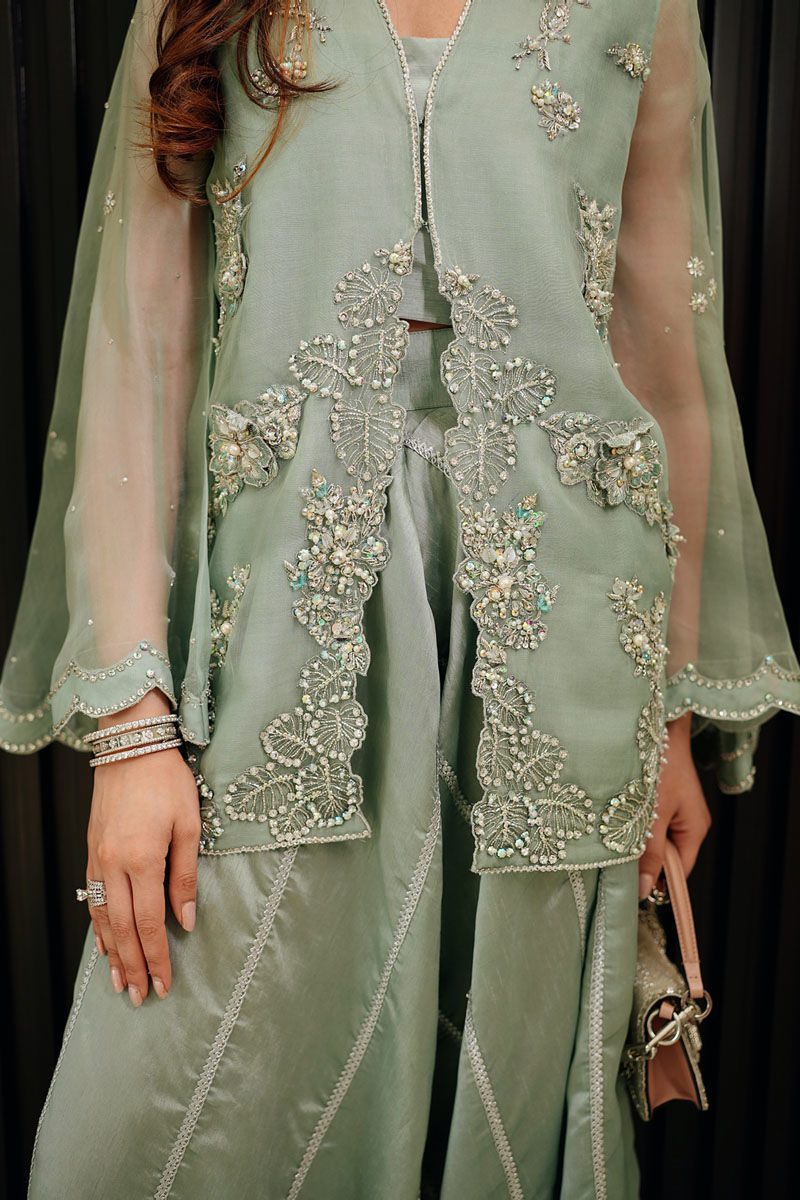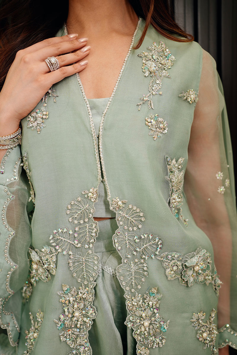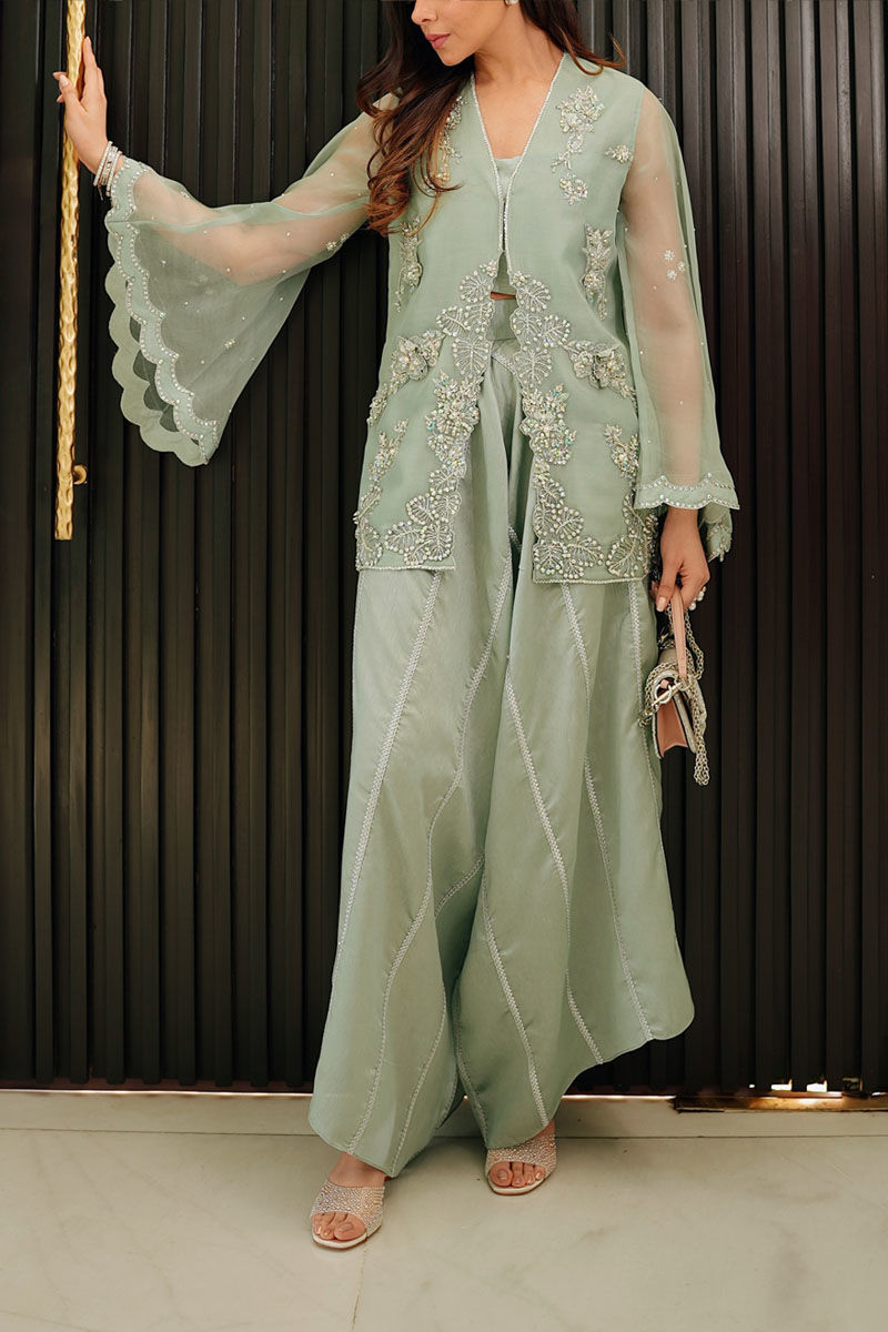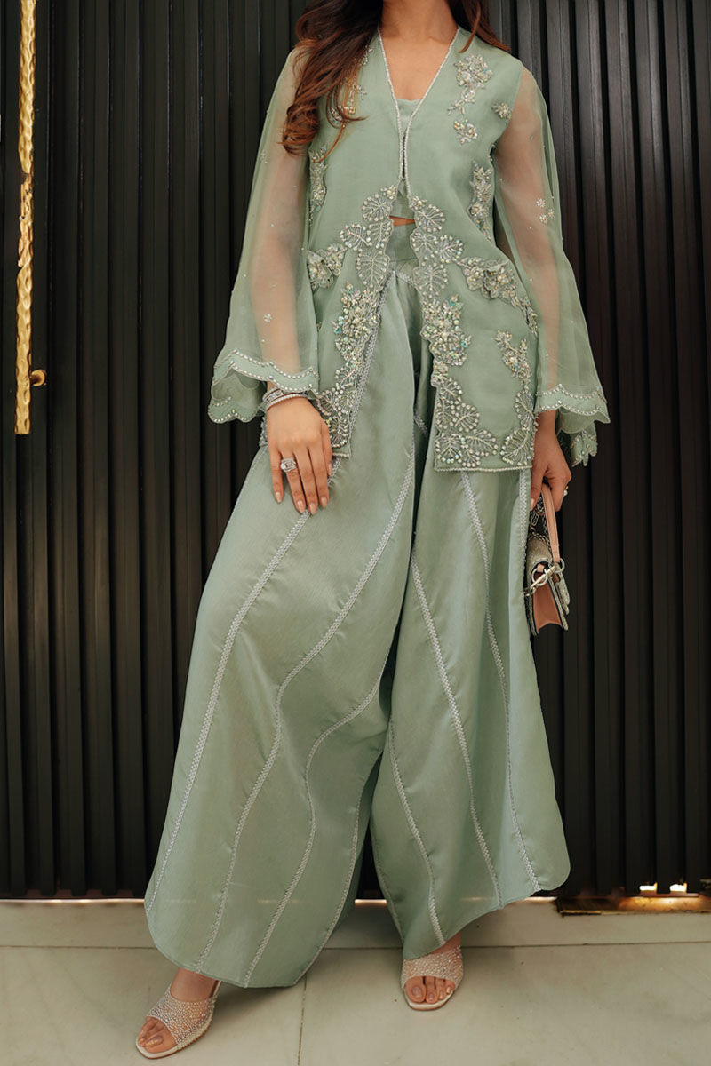 A vision in ice blue - Taliya exudes ethereal grace with its hand-embellished organza jacket, adorned with Swarovski, dabka, pearls, and delicate 3D florals. Finished with bell sleeves and lace-detailed pants, an elegance that speaks softly yet shines effortlessly.