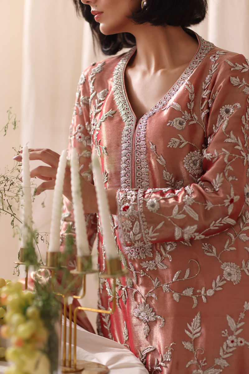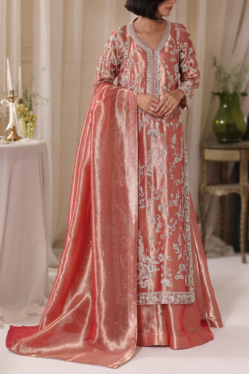 Bathed in a peachy red glow, this tissue shirt gleams with intricate silver nakshi and dabka work across the front and sleeves, while delicate resham graces its borders and cuffs. The ethereal tissue dupatta shimmers with hand-embellished sequins and a silver tissue finish, completing the look with soft brilliance. Paired with a voluminous tissue lehenga lined in silk, the ensemble is a breathtaking ode to timeless romance and regal elegance.