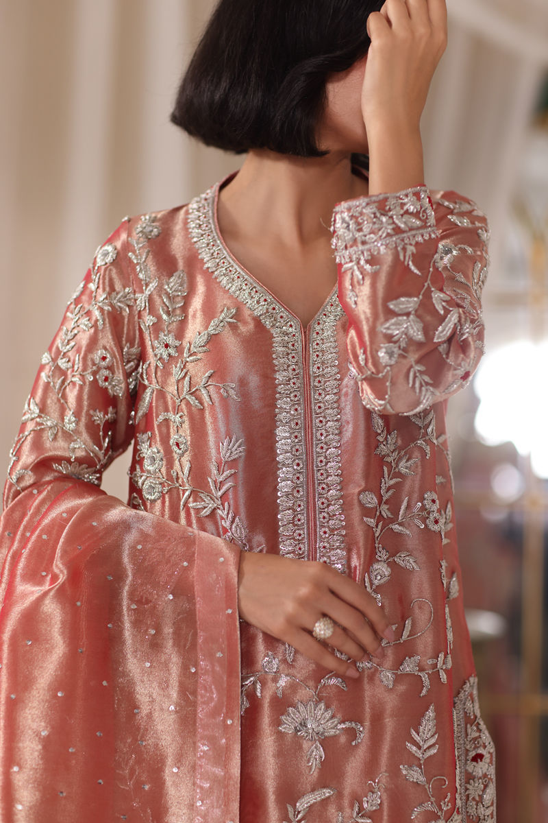 Color: Peachy Red Fabric: Tissue Shirt, Pant and Dupatta Work Details: Embellished