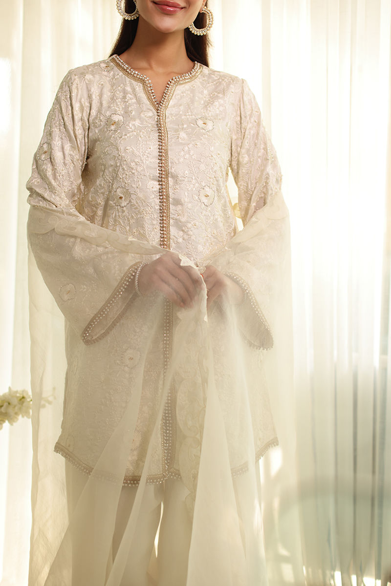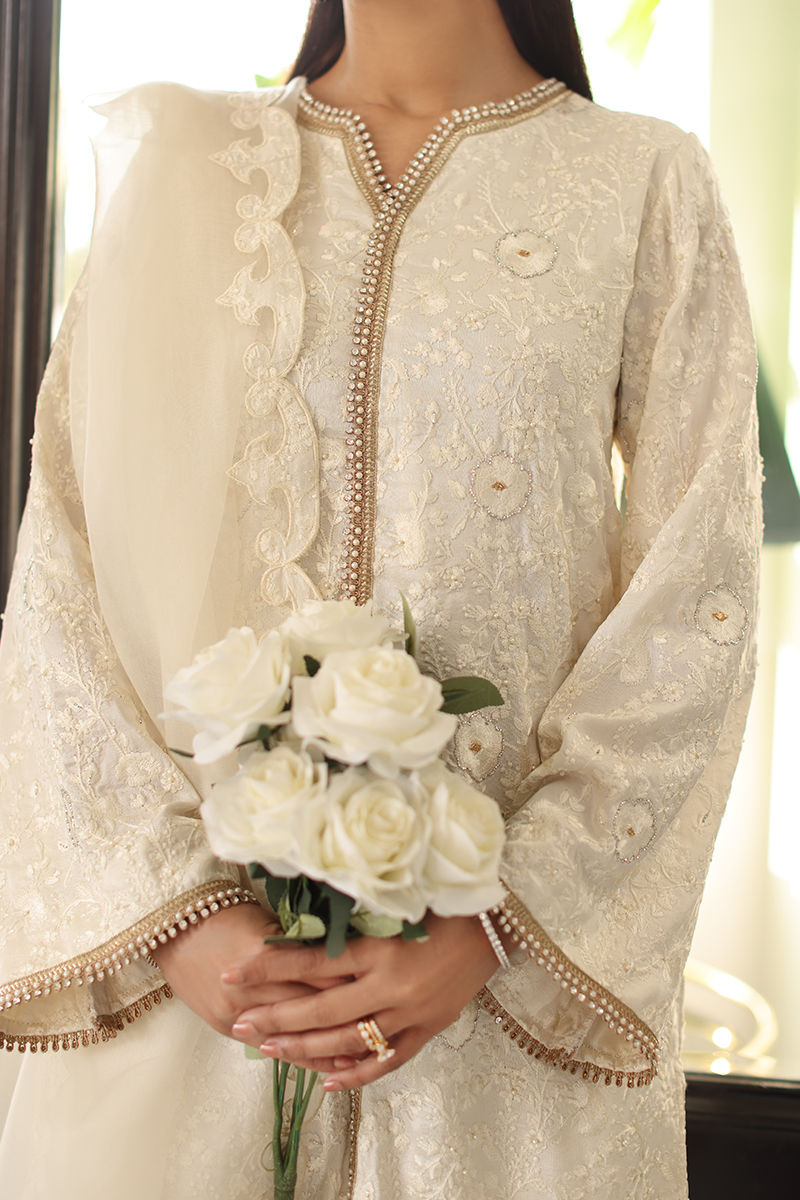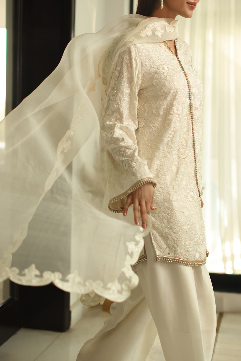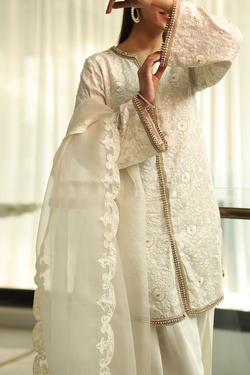 This luxurious ensemble features a pure raw silk shirt, intricately embroidered and hand-embellished with silver cutdana and pearls all over for a rich, luminous appeal. Pearl and gota lace detailing on the front and sleeves adds a refined traditional finish, paired effortlessly with a matching pure raw silk shalwar. The look is completed with an organza dupatta, beautifully adorned with embroidered appliqué all around for graceful movement.