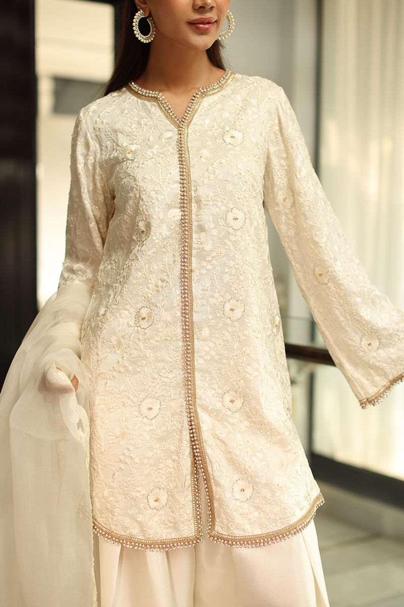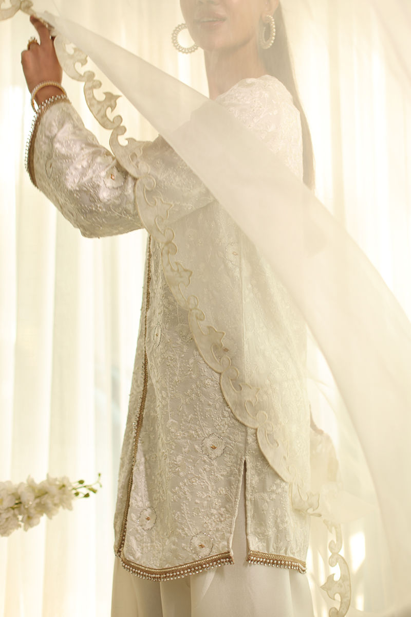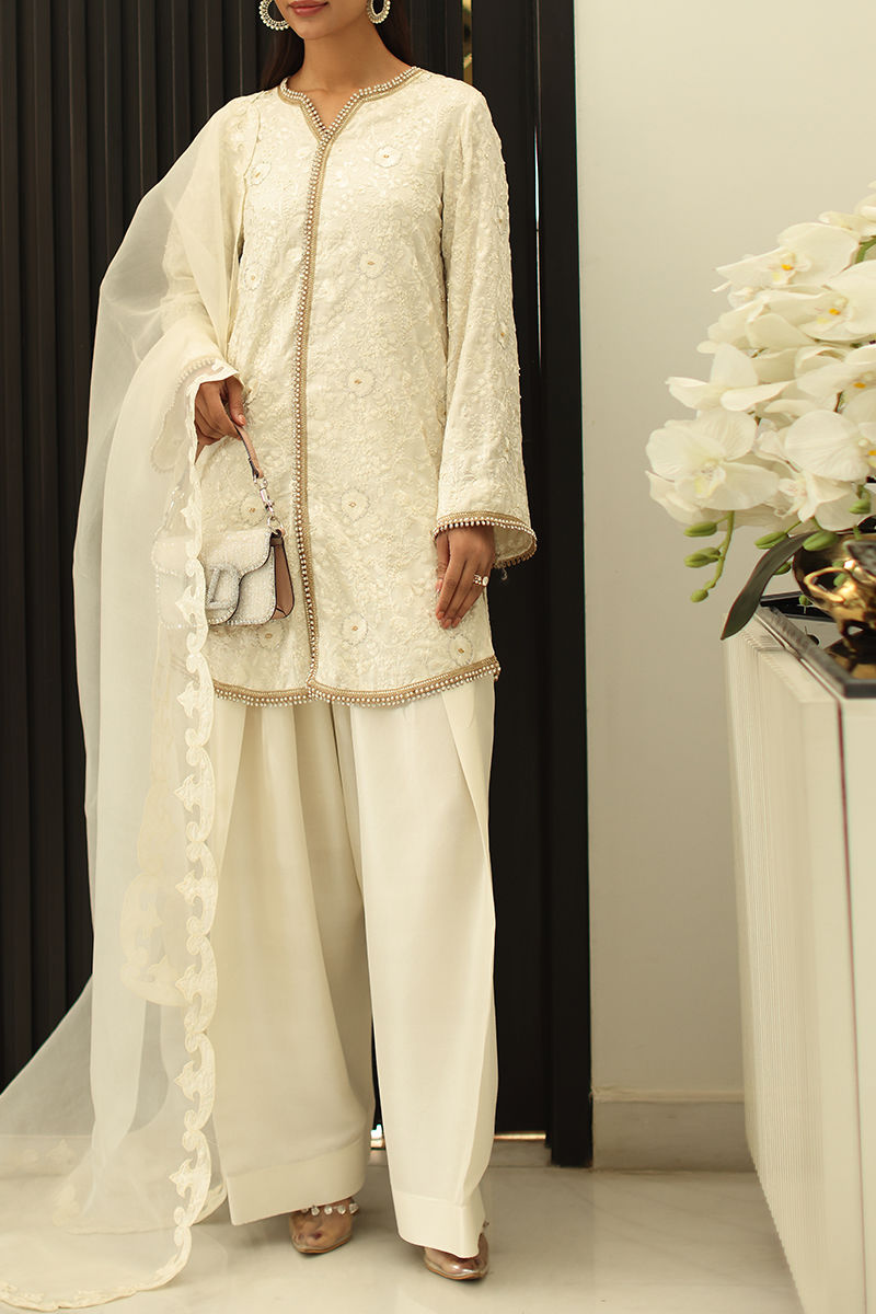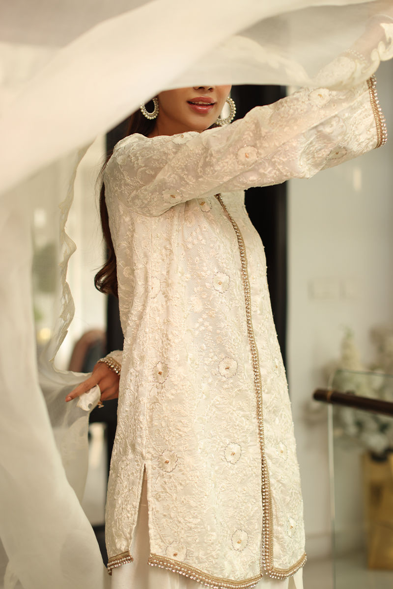 This luxurious ensemble features a pure raw silk shirt, intricately embroidered and hand-embellished with silver cutdana and pearls all over for a rich, luminous appeal. Pearl and gota lace detailing on the front and sleeves adds a refined traditional finish, paired effortlessly with a matching pure raw silk shalwar. The look is completed with an organza dupatta, beautifully adorned with embroidered appliqué all around for graceful movement.