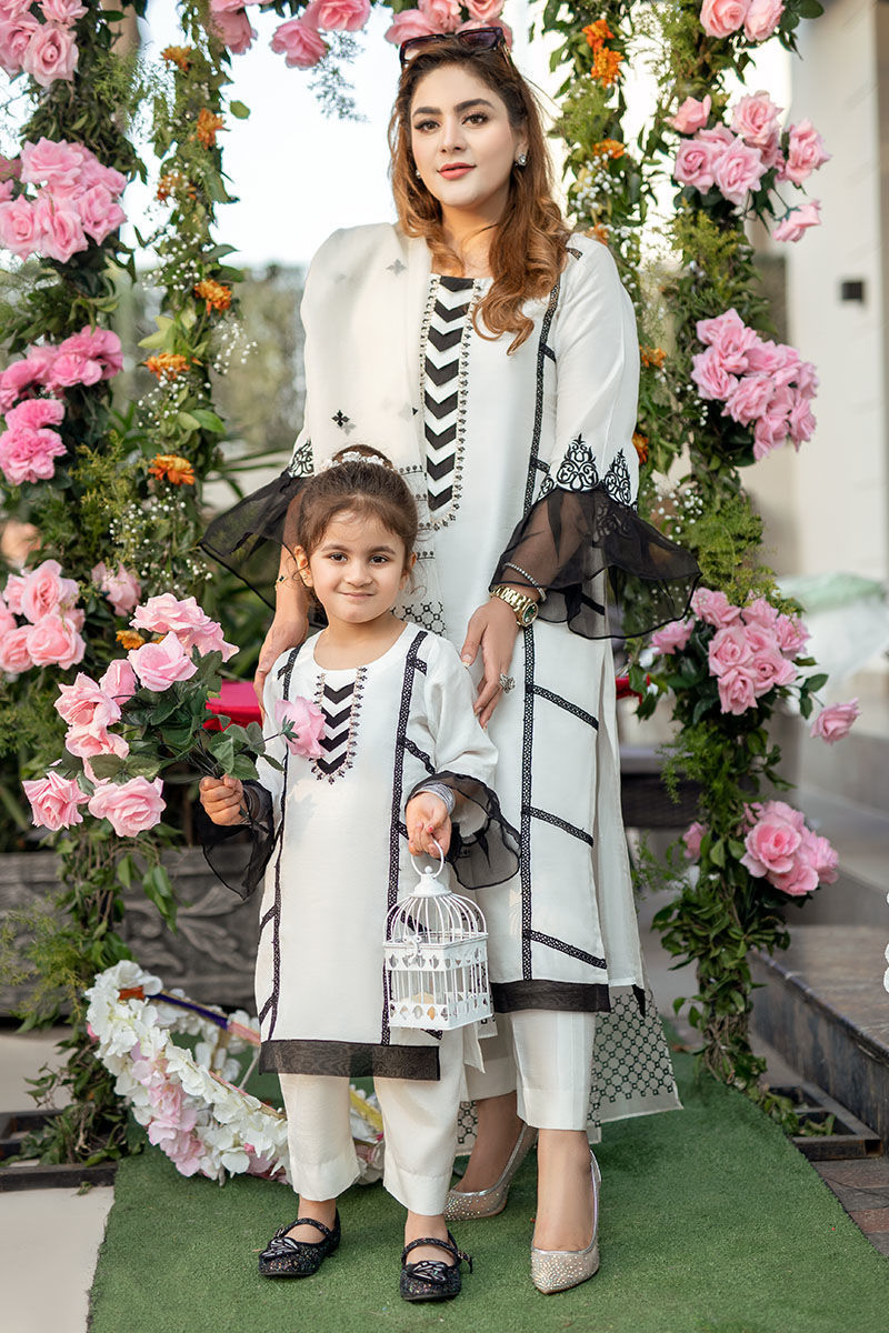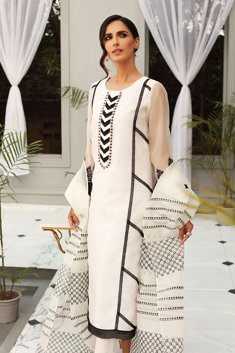 This meticulously worked pearl embellished shirt is our modern take on the classic black and white outfit, With Korean raw silk sleeve. With geometric panel lacework detailing and sequin work embedded on organza, this shirt is a season must have. Finish your look with a complimenting block print dupatta and pants.